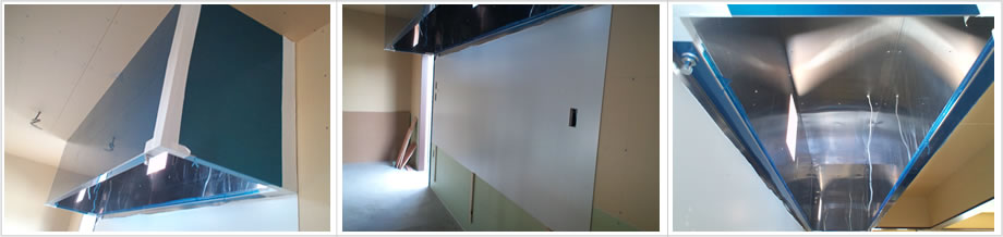 フードの製作・施工依頼を頂きました。 新築のお店の厨房部分に納めるフード、壁貼りの製作、施工でした 長細いフードで、ヘアライン仕上げです 換気扇・コンセント・内部照明配線の穴を現寸し、正確な位置に穴をあけています。 現場で穴をあけると、ひずみがでたり、傷をつけてしまう事があるため、これを防ぎます。 フード下にはフードとまったく同じ横幅のステンレスを壁貼りさせて頂きました。 カウンターを挟んだお客様側からの見た目を美しくするため 1.5mmという厚みのあるステンレス板を使用しています。 家具の隙間に貼る壁貼りも家具設置後施工させていただきました